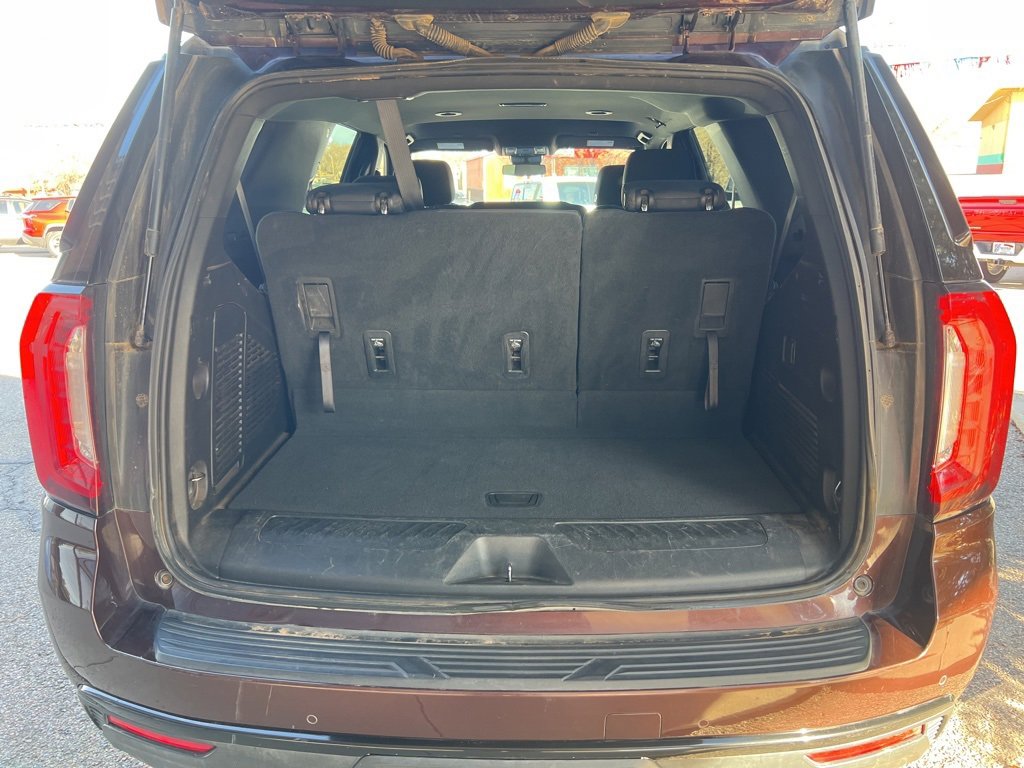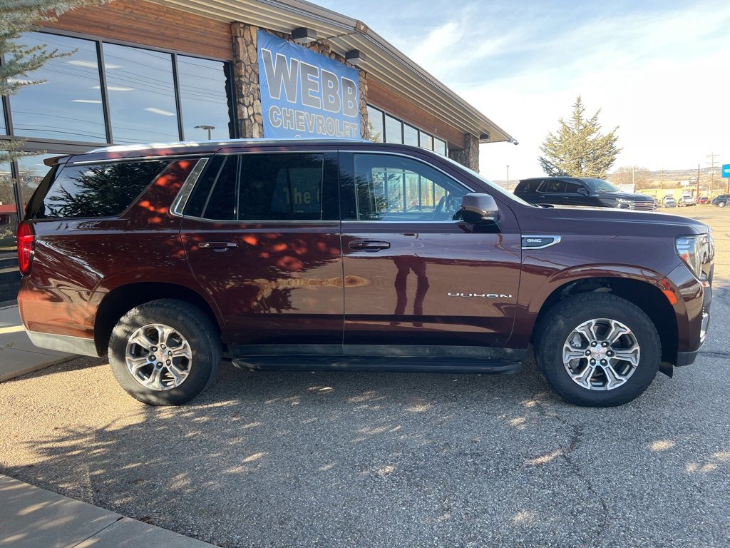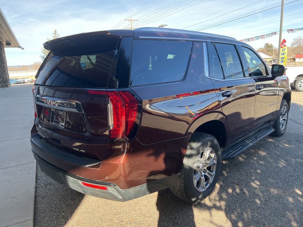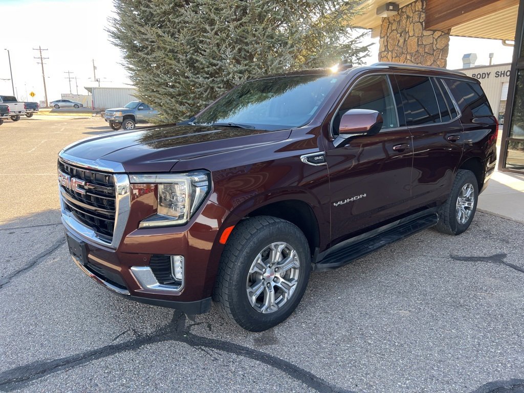 Redwood Metallic 2023 GMC Yukon SLE 4WD 10-Speed Automatic with Overdrive EcoTec3 5.3L V8 Local Trade, 4WD, 3rd row seats: split-bench, 6-Speaker Audio System Feature, Air Conditioning, Alloy wheels, AM/FM radio: SiriusXM with 360L, Apple CarPlay/Android Auto, Automatic temperature control, Brake assist, Compass, Driver vanity mirror, Electronic Stability Control, Emergency communication system: OnStar and GMC connected services capable, Front Bucket Seats, Front Center Armrest, Front dual zone A/C, Front fog lights, Front reading lights, Fully automatic headlights, Heated door mirrors, Lane Departure Warning System, Navigation System, Outside temperature display, Overhead console, Passenger vanity mirror, Power door mirrors, Power driver seat, Power passenger seat, Power windows, Preferred Equipment Group 3SA, Premium Smooth Ride Suspension, Rain sensing wipers, Rear air conditioning, Rear reading lights, Rear seat center armrest, Rear window defroster, Rear window wiper, Security system, Speed control, Split folding rear seat, Steering wheel mounted audio controls, Traction control.